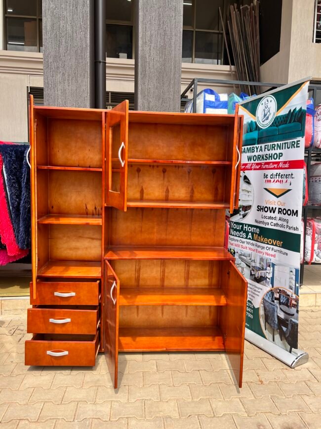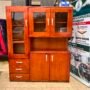 A multipurpose wooden cabinet in a glossy reddish-brown finish with glass doors, drawers, and lower storage compartments. Great for dining rooms or living spaces