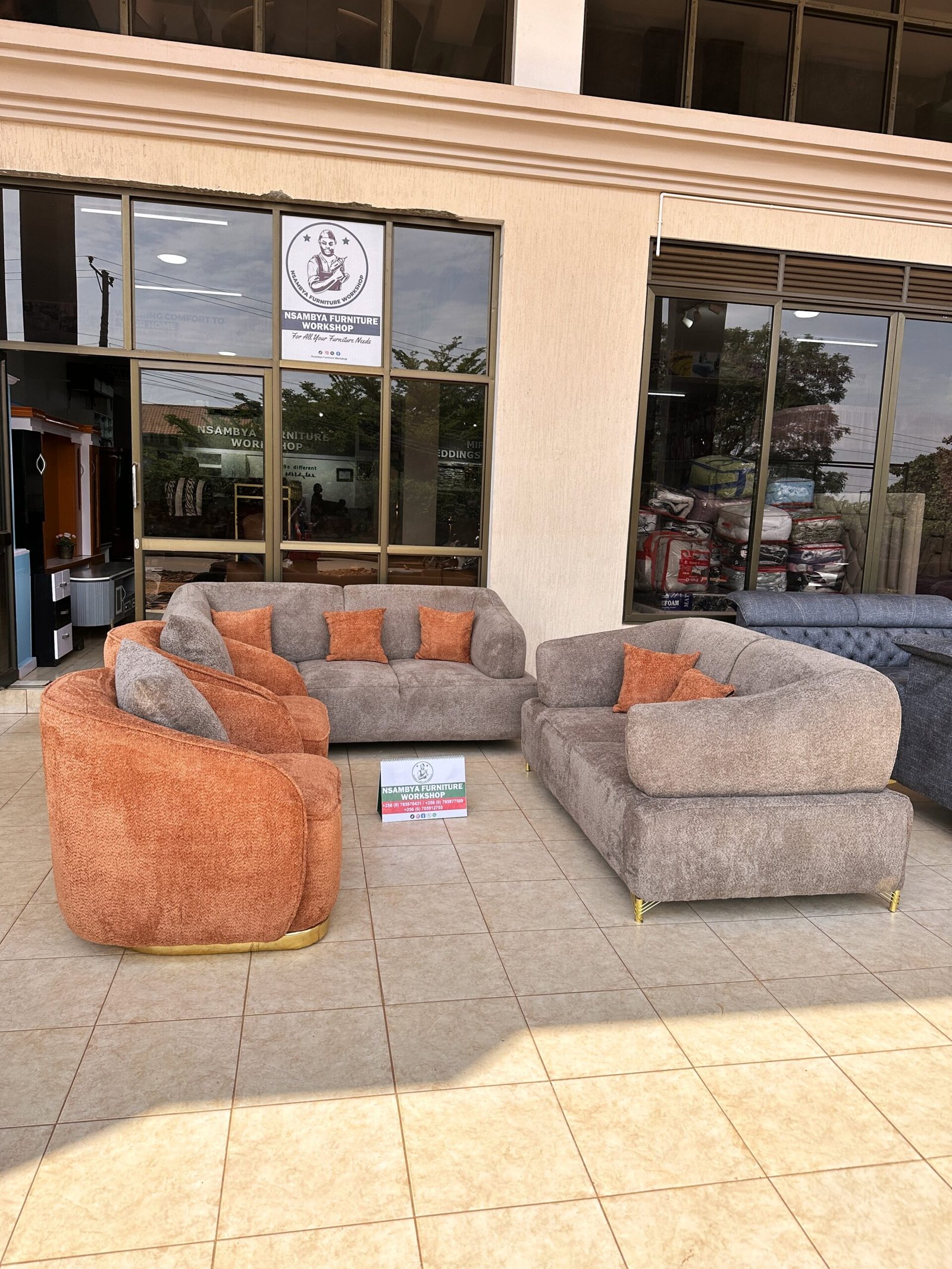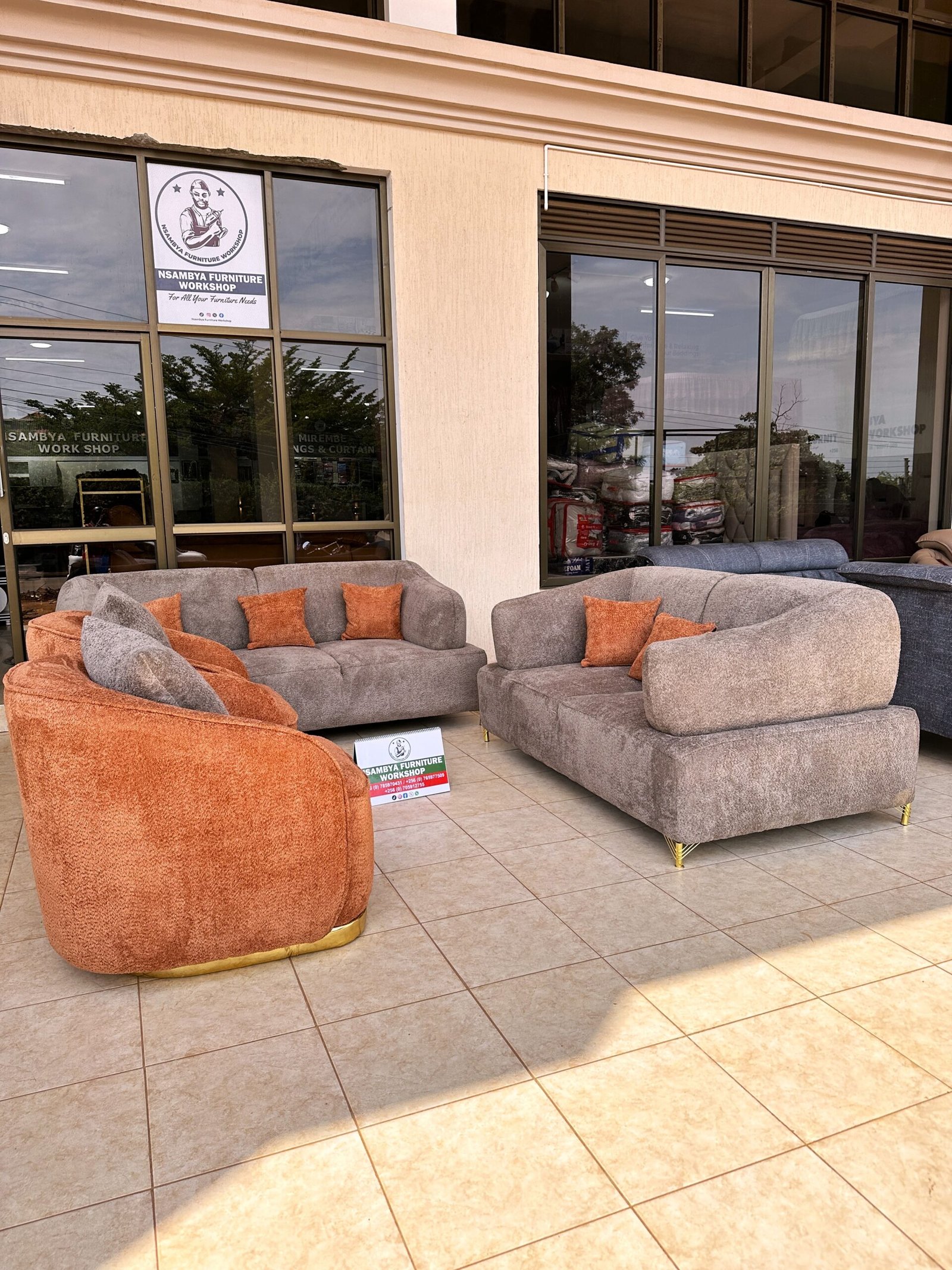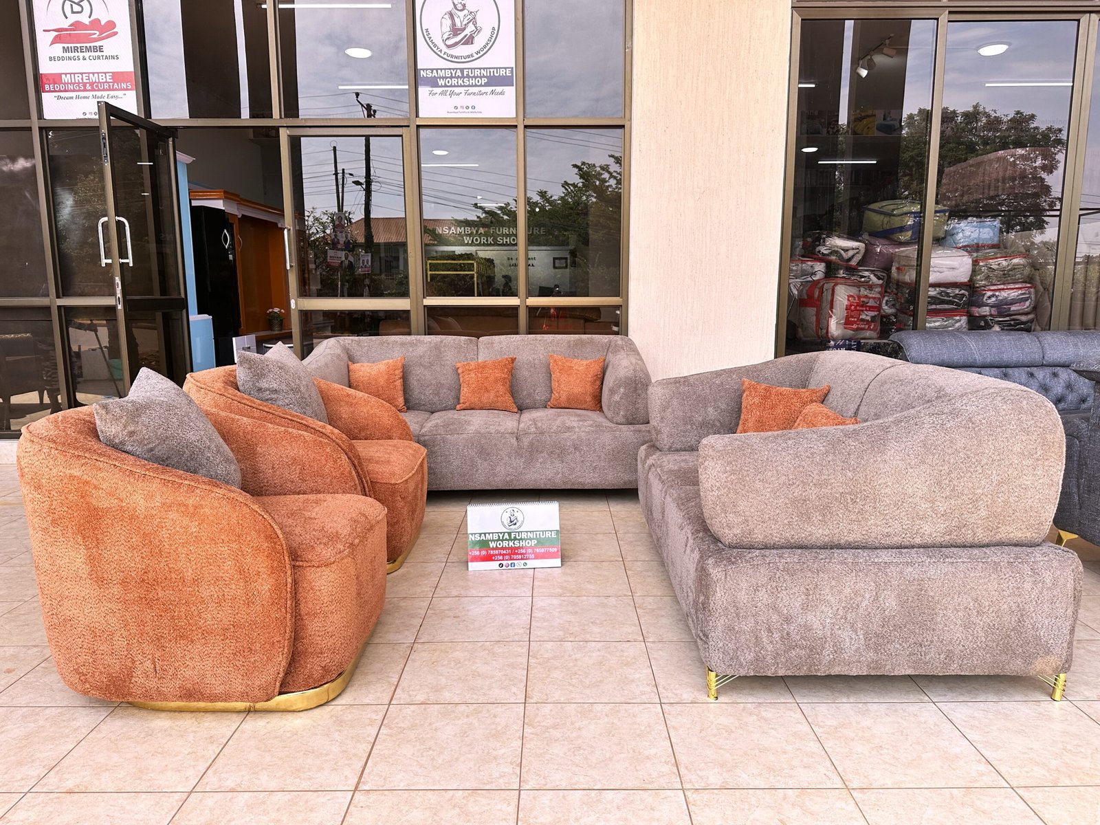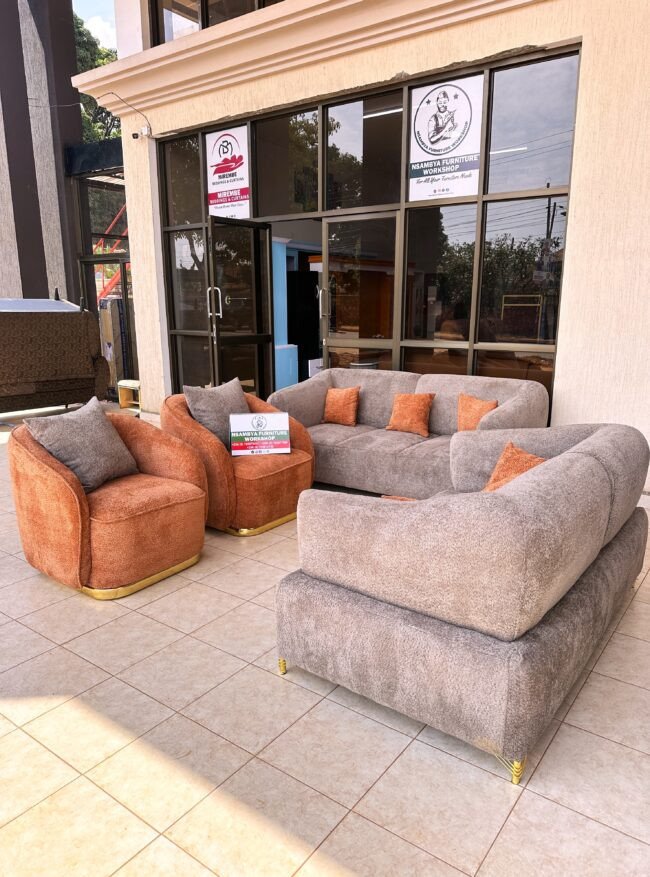 Envelop your living space in unparalleled comfort and contemporary style with The Horizon Embrace 7-Seater Sofa Set from Nsambya Furniture Workshop. This magnificent collection is designed to be the ultimate retreat, offering generous seating for up to seven individuals while exuding a unique blend of warmth and modern sophistication. Its defining characteristic is the captivating two-tone color palette, where inviting grey or muted brown tones elegantly transition into vibrant orange or rich terracotta hues, reminiscent of a beautiful sunset horizon.