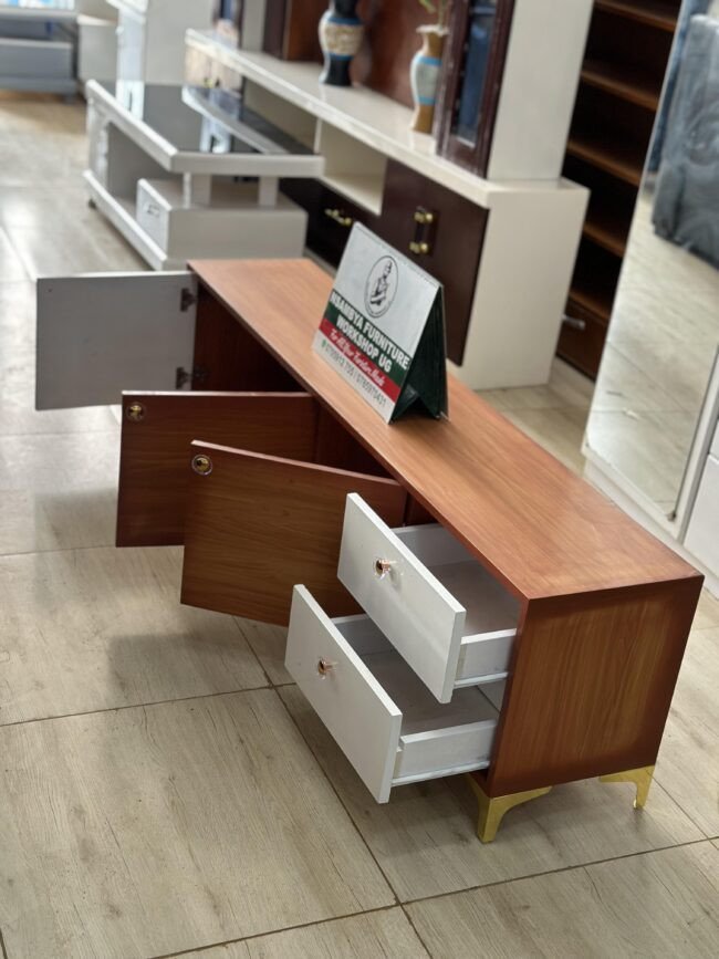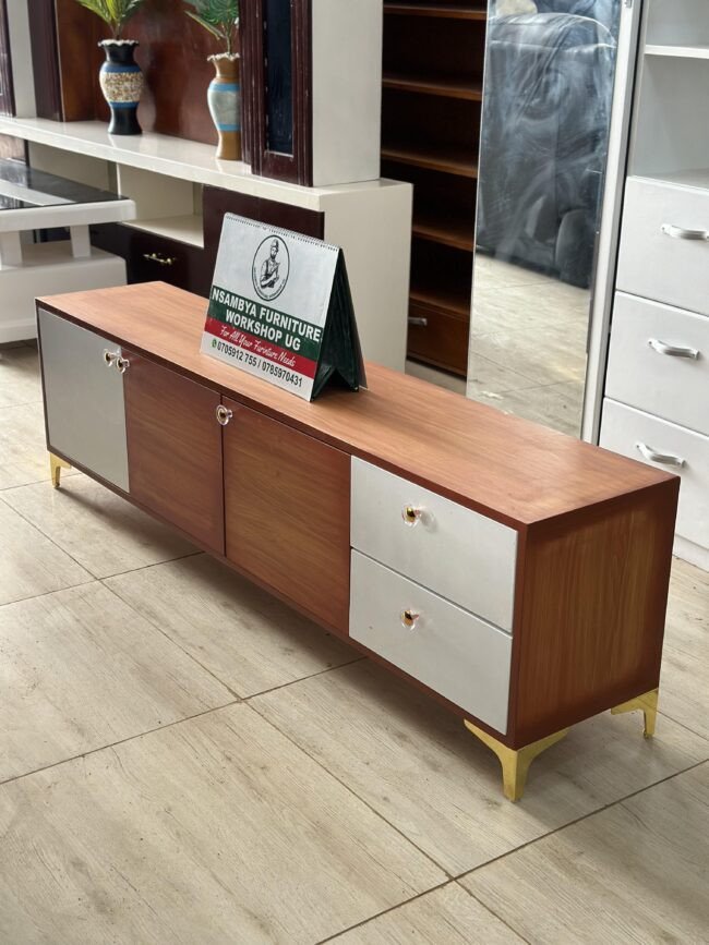 Elevate your home entertainment setup with The Modern Accent TV Unit from Nsambya Furniture Workshop. This striking piece is designed to be both a stylish focal point and a highly functional media console, perfectly blending contemporary aesthetics with practical storage. Its most distinctive feature is the captivating two-tone design, often showcasing rich wooden tones for the main structure contrasted beautifully with lighter, sleek panels for doors or drawers. This sophisticated contrast adds depth and visual interest, making it a true accent piece in any living room.