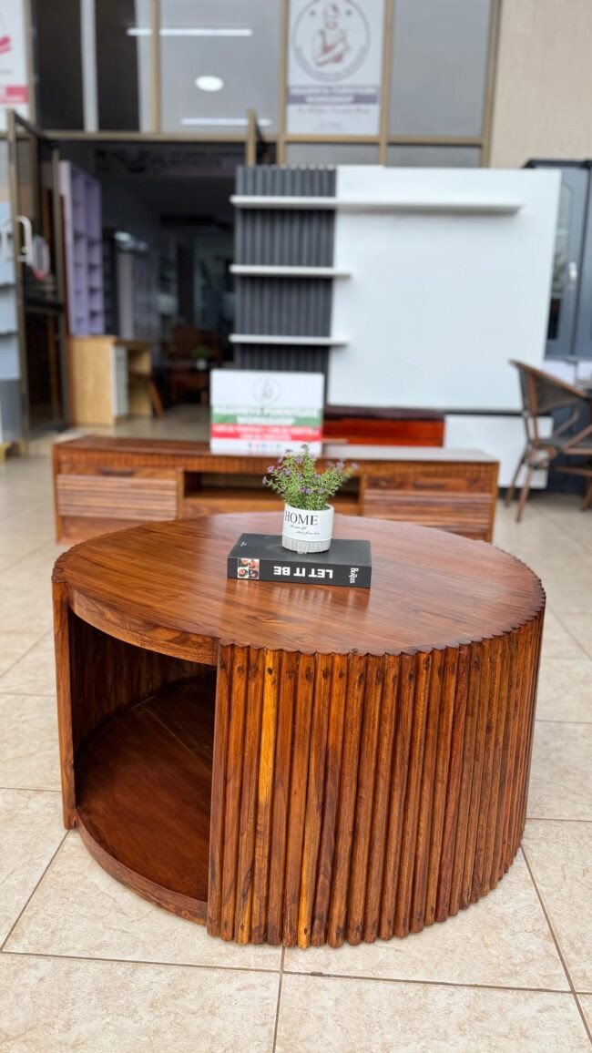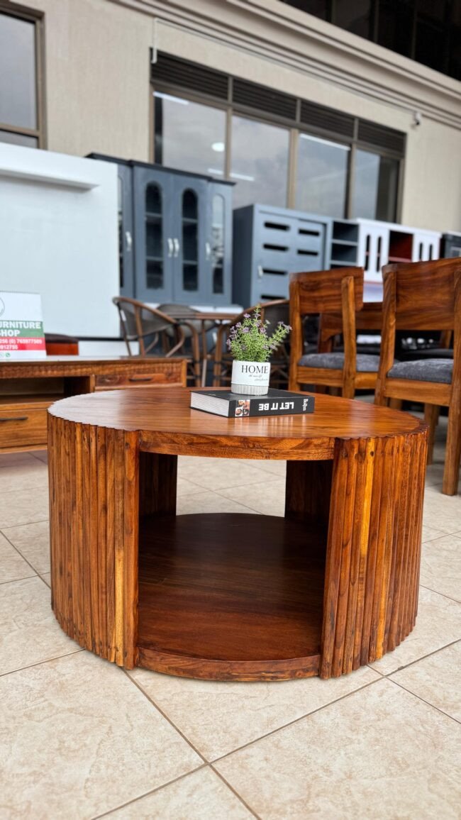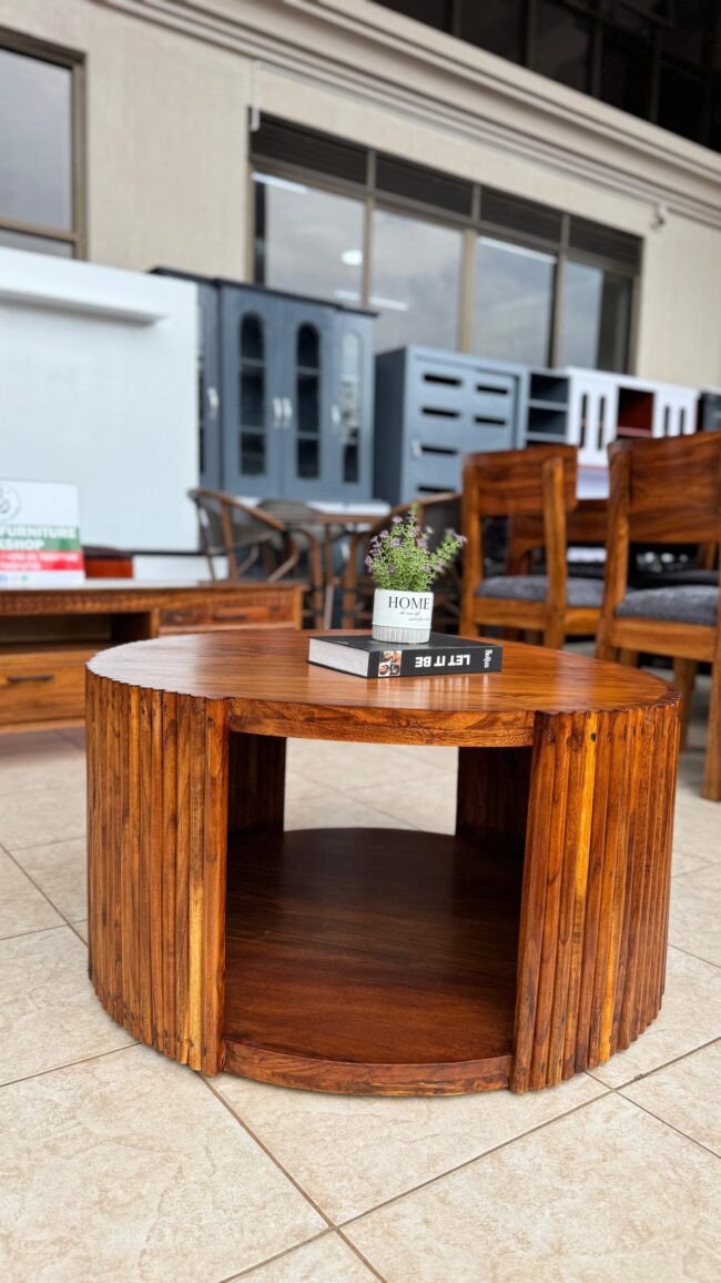 A modern round coffee table crafted from high-quality hardwood with a smooth natural finish. Designed with a functional open shelf for storage or décor display. Its curved vertical slat detailing adds character and warmth to your living room setup. Strong, stylish, and built to last.