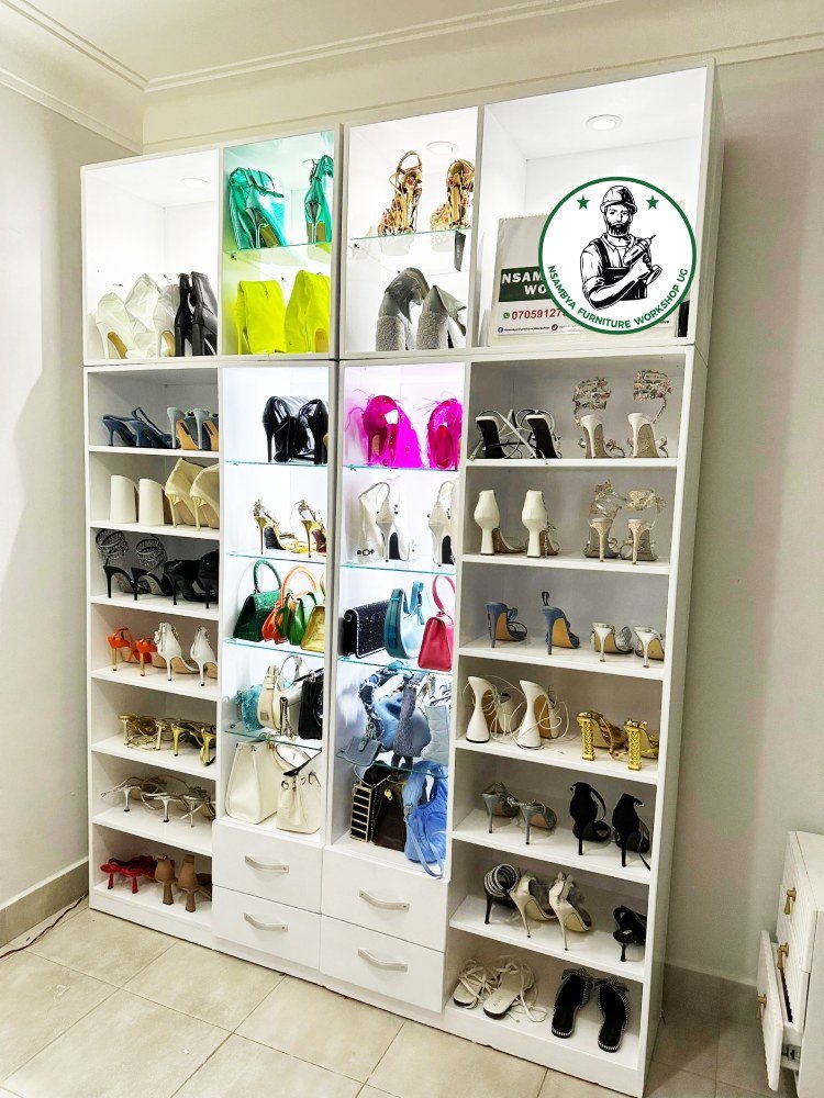 Organize and showcase your footwear and accessories in style with our Shoes and Bags Rack with Lighting Sleeves. This innovative rack features integrated lighting sleeves that highlight your shoes and bags, adding a touch of elegance and enhancing visibility. Crafted from high-quality materials, the rack provides sturdy and durable storage solutions. Its sleek design and illuminated display make it a perfect addition to any closet, entryway, or dressing room, combining functionality with modern aesthetics. Keep your items neatly arranged and beautifully presented with this chic, illuminated storage rack. All at Nsambya Furniture Workshop Ug