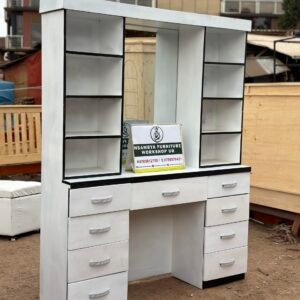 Elevate your daily routine with the sleek and highly functional Modern Vanity Dresser from Nsambya Furniture Workshop. This versatile piece is designed to be the ultimate personal grooming station and storage solution, blending contemporary aesthetics with smart utility. The crisp white finish, accented by bold dark trim, creates a striking and clean look that seamlessly fits into modern bedrooms or dressing areas.